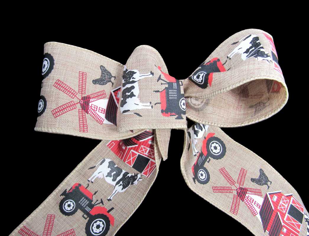 10 Yard Roll of 2 1/2″ Wide Wired Barnyard Ribbon. Natural background in a barnyard theme with cow, chicken, tractor and barn. Will make your Farm themed project look great. Cow lovers rejoice!!!