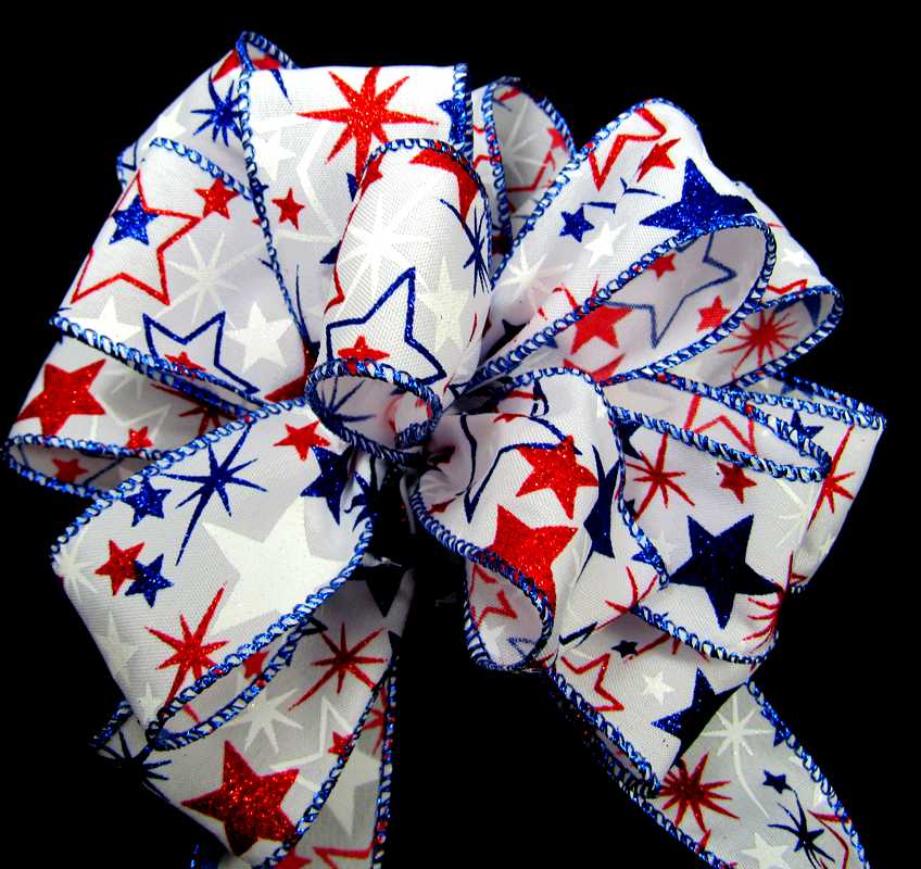 10 Yard Roll Wired Fourth of July Ribbon. Comes in white with multiple coloerd stars.  This beautiful ribbon makes a really nice bow that can be used for your Fourth of July celebration.